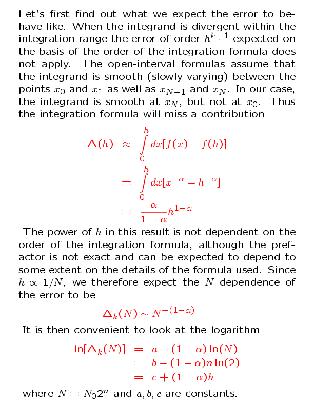 Some examples of how the error scales with the spacing h in numerical integration of a function with an integrable singularity or a peak that is almost singular. We investigate the scaling of the error as a function of the number of intervals N used (h~1/N). A) Non-singular integrandThese are results along with lines with slope 2 and 3. The expected error scaling for small h is confirmed. Note that there are small deviations from the linear behavior for the largest h, showing the presence of higher-order corrections to the scaling.![]() B) Singular integrand![]() The exponent can be extracted by plottng the logarithm of the error versus log(h) [or log(N) or n]. ![]() ![]()