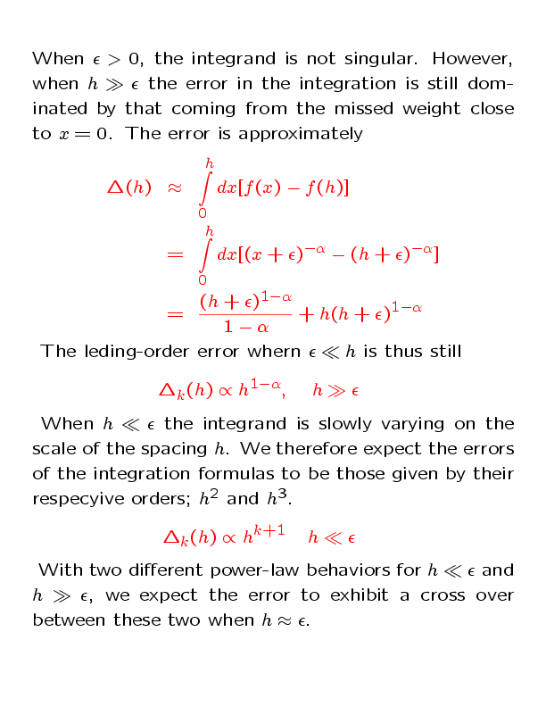 C) Almost singular integrand![]() The figure below shows results using alpha=1/2 and epsilon=0.00001. ![]() The lines show the expected slopes 1/2 (for h much larger than epsilon) 2 (for h much less than epsilon with 1st-order formula) and 3 (for h much less than epsilon with second-order formula). |