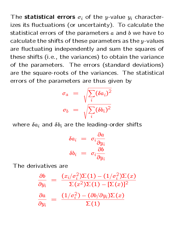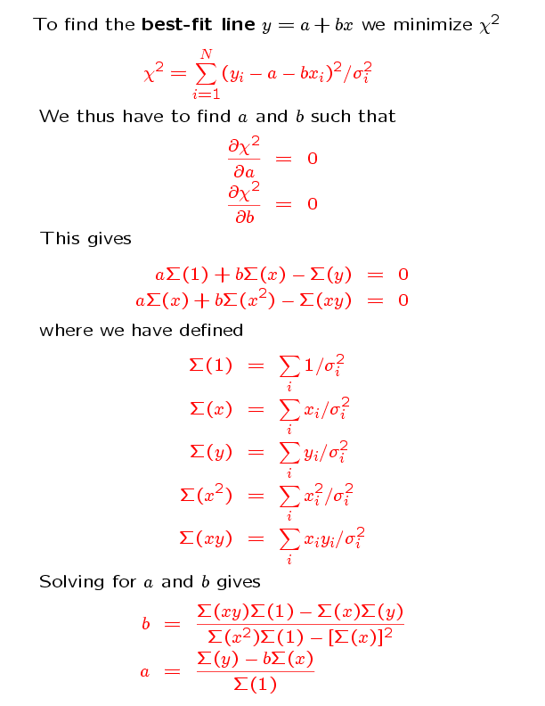 We often encounter the problem of finding the line that best reproduces (fits) the behavior of numerical data (from calculations or experiments). Often the data have error bars, i.e., we have points x(i),y(i),s(i), where i=1,....,N and s(i) is the standard deviation of y(i). ![]() ![]() This is a Fortran 90 line-fitting program [linefit.f90] Running the brogram with this data set gives the outputIntercept and expected error : 0.22112252494404125 0.009332726022970368 Slope and expected error : 0.5506251596885045 0.002800789912660865 Number of data points : 51 X2 per degree of freedom : 1.170613622829978 The data was generated by adding noise (distributed according to Gaussians with mean 0 and variable width equal to the stated errors) to a line y=a+bx with a=0.23 and b=0.55. These parameters are seen to be reproduced by the fitting program to within statistical errors. This graph of the data was generated using Xmgrace![]() |
