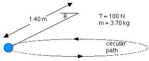 A ball on a 1.4-meter long string is being whirled in mid-air in a horizontal circle at a constant speed v. The tension in the string is 100 N. The mass of the ball is 3.70 kg.